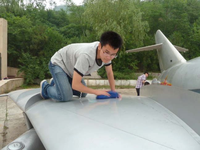在开展了航博馆志愿者活动之后,为了更一步推进党支部成员对航空一线工作的了解,为了促使全党支部成员向一线工作者看齐,从一线航空工作者的身上汲取前进的动力,真正培养“爱祖国、爱航空、爱航天、爱北航”的大爱精神,党支部又组织了党支部成员以及入党积极分子参与中国航空博物馆飞机表面维护工作。飞机表面维护工作有关知识与技巧的讲解工作由一位驻馆的官兵担任,驻馆官兵以露天停机坪上的歼六飞机作为示范,从飞机表面维护工作的基本原理到日常飞机表面维护的基本流程与步骤,为党支部的志愿者们进行了耐心,细致的讲解。志愿者们也因此了解到了航空一线工作的基础内容,对航空一线工作者也有了更深入的认识。