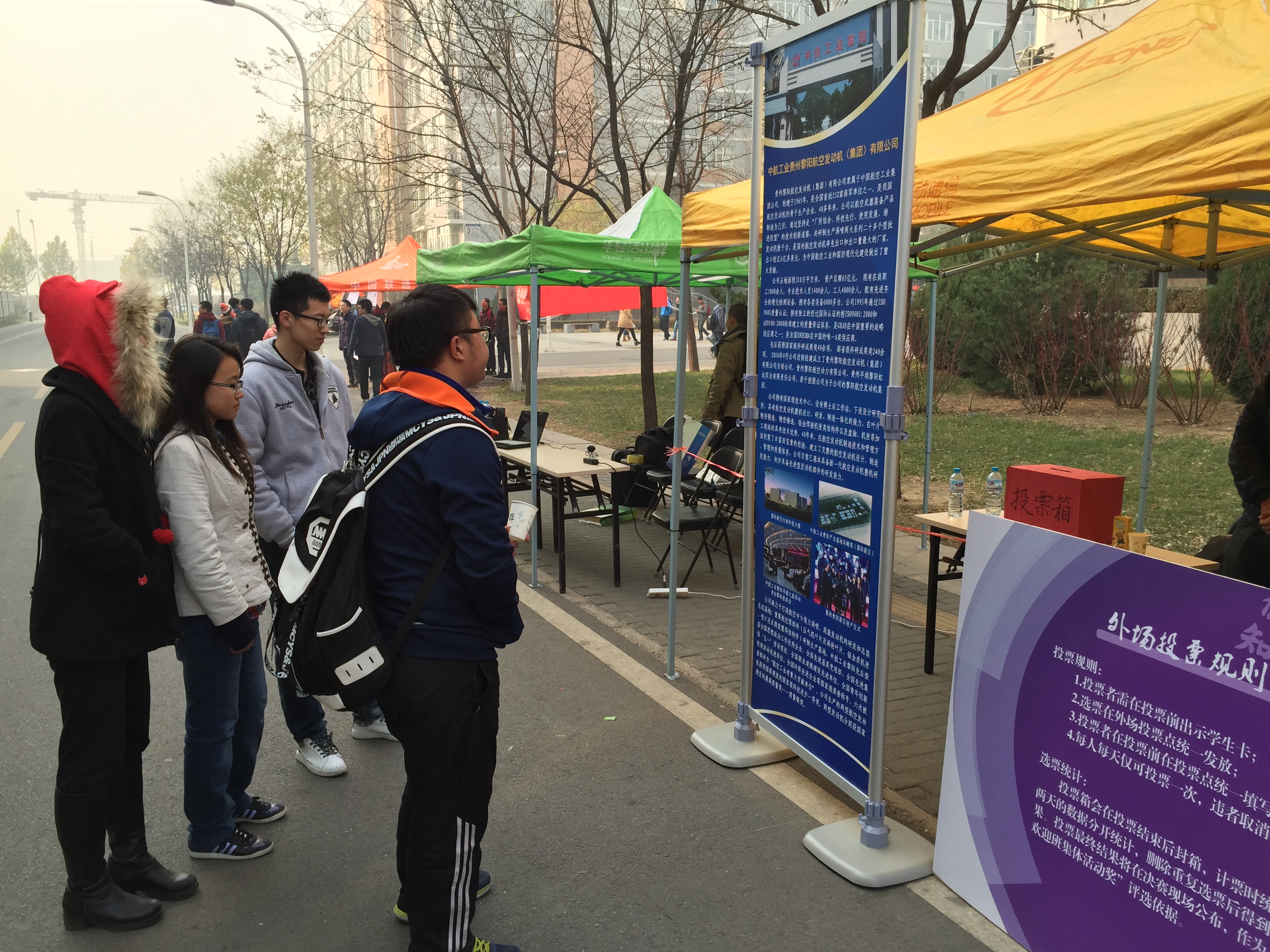 “中航黎阳杯” 北京航空航天大学2014级本科新生最佳班集体活动答辩赛外场展示于11月19日与20日在沙河校区1,4号学生公寓楼之间开展,参加本次外场展示的是晋级决赛的十四个班级。