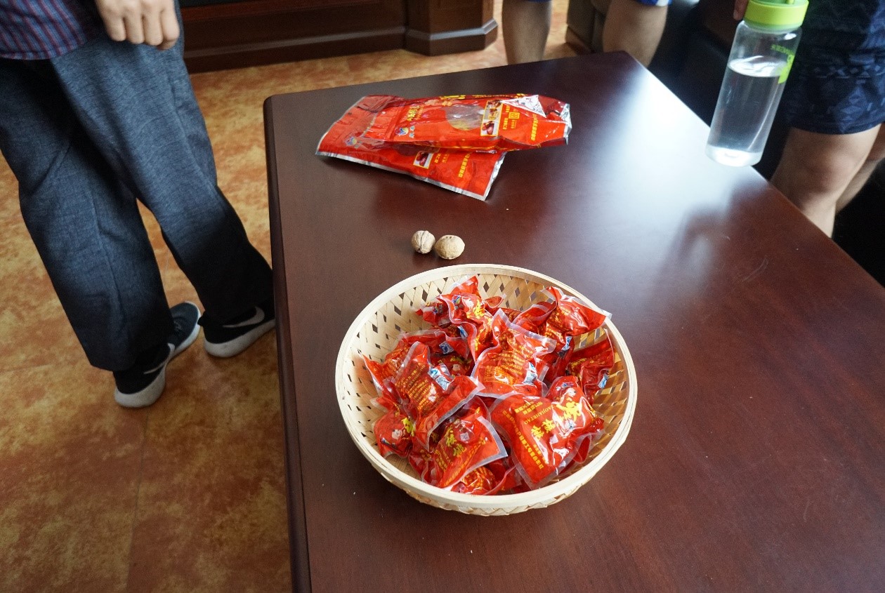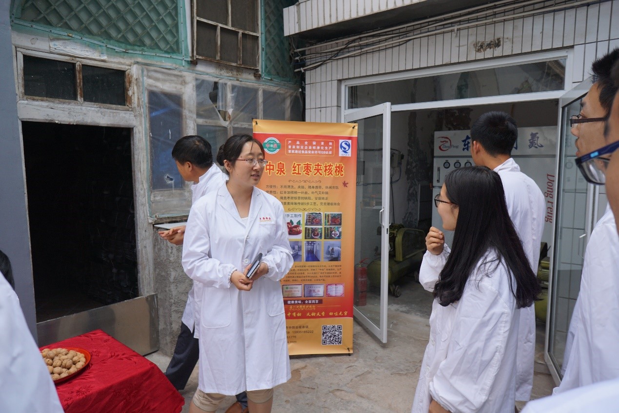 第一站是中阳县凯宇农产品加工专业合作社。该合作社建于2015年,是一家刚兴起的专业从事核桃、红枣、枣夹核桃等农副产品加工的企业。我们有幸参观了厂房,并与高厂长进行了亲切的交谈,了解了核桃加工产业的现状和未来前景以及产品销售的有关情况。在高厂长的热情接待下,我们还有幸品尝到了刚从冷库拿出来的美味的枣夹核桃。