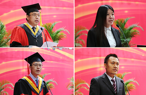 机械工程及自动化学院博士生导师张德远教授代表研究生导师为全体毕业生送上了祝福和期许,希望每一名毕业生都能成为自信自强的北航人;在校生代表、生物与医学工程学院硕士研究生刘佳佳同学对每一位学长学姐为传承北航文化、氛围和情怀所做出的努力表示了感谢,毕业生代表、仪器科学与光电工程学院博士研究生刘超同学在发言中与大家分享了自己的求学历程和对母校以及师友亲朋难以割舍的情怀,号召全体毕业生传承北航人“心系祖国,勇于担当”的价值承诺。优秀校友代表何巍博士回顾了在母校学习和生活的点点滴滴,对北航在自己身上留下的“求真务实”的烙印表示难忘和感激。何巍校友通过分享长征五号的研发过程中的故事,鼓励全体毕业生把握历史机遇,胸怀空天报国豪情,不忘初心,敢为人先,为国家繁荣富强而不懈奋斗。