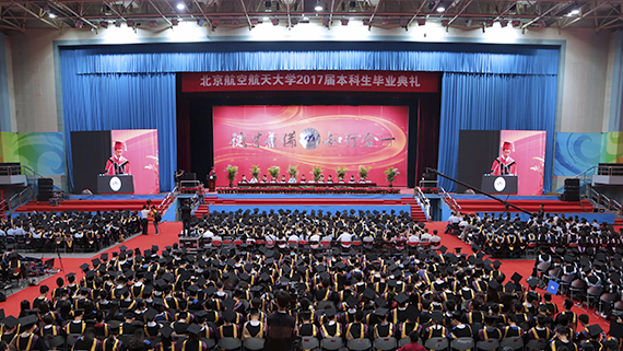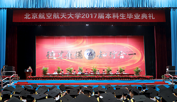 北航新闻网6月17日电(记者 孔祥明/文)6月17日上午,北京航空航天大学2017届本科生毕业典礼在北航体育馆隆重举行。校领导张军、徐惠彬、魏志敏、何新洲、程基伟、陶智、房建成、黄海军、李军锋、王云鹏,教师代表、电子信息工程学院刘建伟教授,空军航空大学政委薛宏伟将军,校友代表、C919试验现场总指挥刘文恭先生等领导和嘉宾与来自27个学院的3911名全日制本科毕业生和96名本科留学生,以及400余位学生家长欢聚一堂,共同见证2017届本科毕业生的美好时刻。