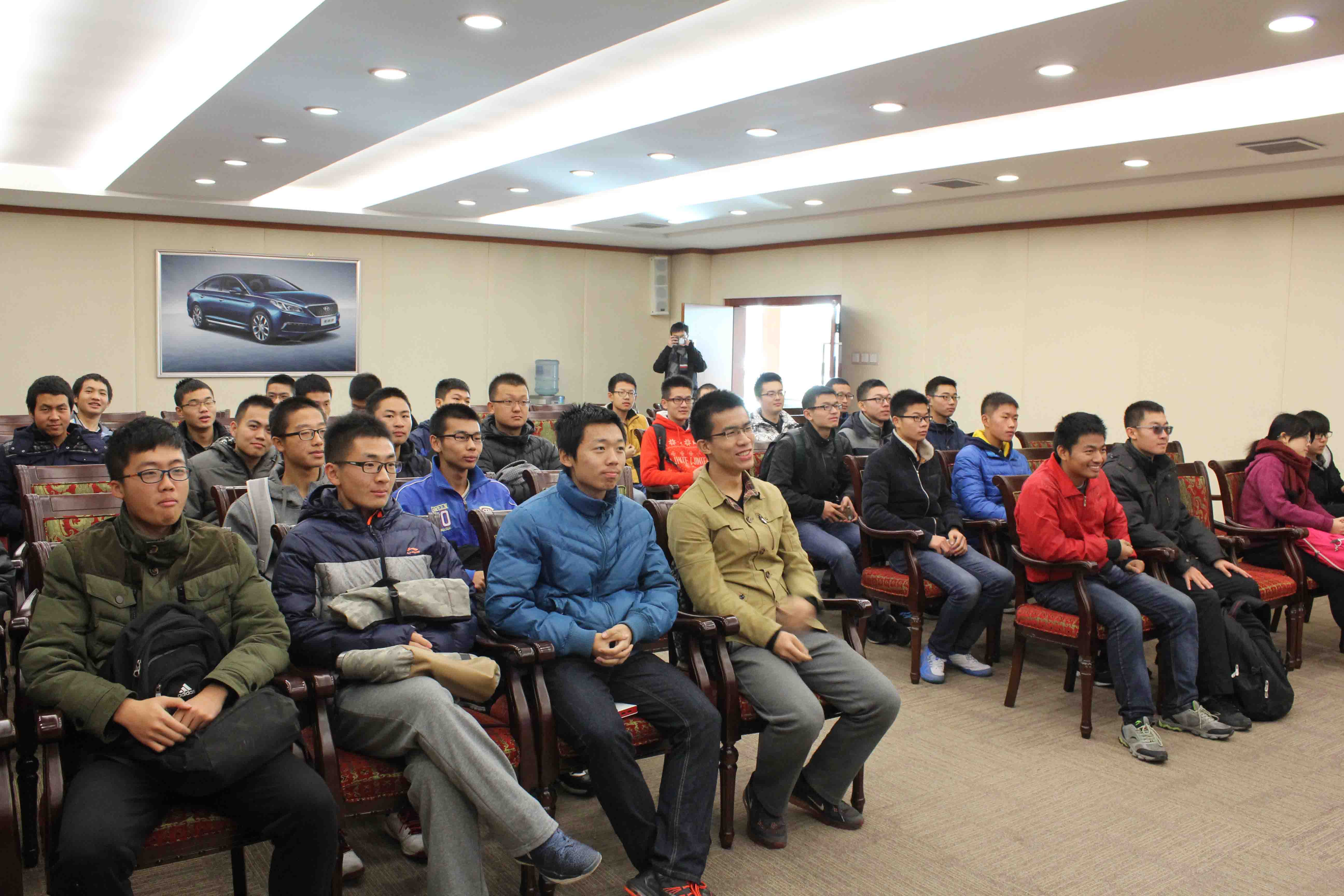 在抵达后,同学们受到了工作人员的热情接待。工作人员首先为同学们放映了北京现代公司的宣传片和汽车设计制造揭秘记录片。从宣传片中同学们了解到,北京现代汽车有限公司最初由中韩两国合资建成,在短短几年时间内就先后突破了100万辆、200万辆的生产大关,领略到了北京现代在企业管理和市场营销上的成功。通过汽车设计制造的纪录片,同学们整体了解了一辆汽车从卷形钢板到整车的制作过程。纪录片以现代汽车工厂为依托,为同学们详细介绍了汽车生产的冲压、焊接、涂装、总装四个工艺过程。
