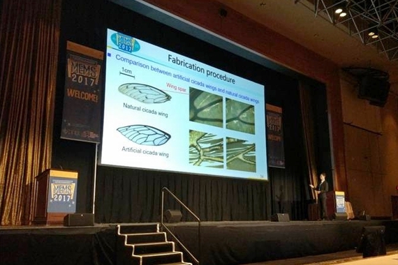 北航新闻网2月27日电(通讯员 赵鑫) 日前,IEEE第30届国际微机电系统会议(MEMS 2017)在美国Las Vegas举行,我校必发bf88官网博士生刘志伟做了题为《Artificial Insect Wings With Biomimetic Morphology And Stiffness》的大会报告(作者:Zhiwei Liu, Xiaojun Yan*, Mingjing Qi, Yi Yang, Xiaoyong Zhang, and Liwei Lin),介绍了我校与加州大学Berkeley分校合作研制的柔性仿生飞行昆虫翅翼的研究进展。该仿生翅翼采用高精度激光切割和多层材料键合工艺加工而成,可以实现与真实昆虫翅翼几乎相同的形貌、质量、弯曲刚度和固有频率等特征,为后续仿生昆虫的自主飞行奠定了重要基础。