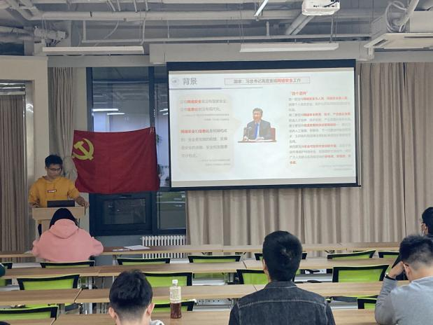 首先由团支书杨冬华主持会议,介绍了本次活动的第一项活动:向党推优,答辩人依次分别为李睿峰、彭明鑫、宋懿娜、台云硕、赵浩印,随后答辩正式开始,五名答辩人依次上场,从自我介绍、入党动机、参与党组织的各项活动等方面切入,介绍了自己的基本情况。关祥翰同志和杨冬华同志随后分别向答辩人提出了自己所关心的问题。之后,宣传委员郑儒道带领大家学习了2021网络安全周宣传材料的学习。习总书记强调,没有网络安全就没有国家安全,没有信息化就没有现代化,并且网络安全和信息化是相辅相成的;安全是发展的前提,发展是安全的保障,安全和发展要同步推进。