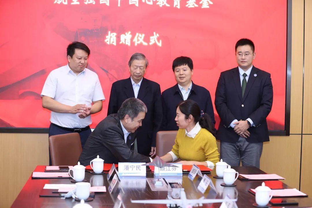 中发天信集团公司潘宁民副总经理、北航教育基金会颜江芬秘书长签署捐赠协议,刘大响院士、庄岩书记、闫晓军院长、刘臣董事长共同见证。