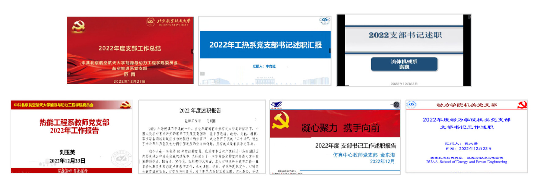 航空推进系党支部书记范雨、工程热物理系党支部书记李育隆、流体机械系党支部书记袁巍、热能工程系党支部书记刘玉英、能源工程系党支部书记刁训刚、仿真中心党支部书记金东海、机关党支部书记魏大盛,从学习贯彻习近平新时代中国特色社会主义思想和党的二十大精神、落实基层党建重点任务、加强支部班子和制度建设、组织生活开展情况、支部工作成效问题及改进思路五个方面分别进行述职。