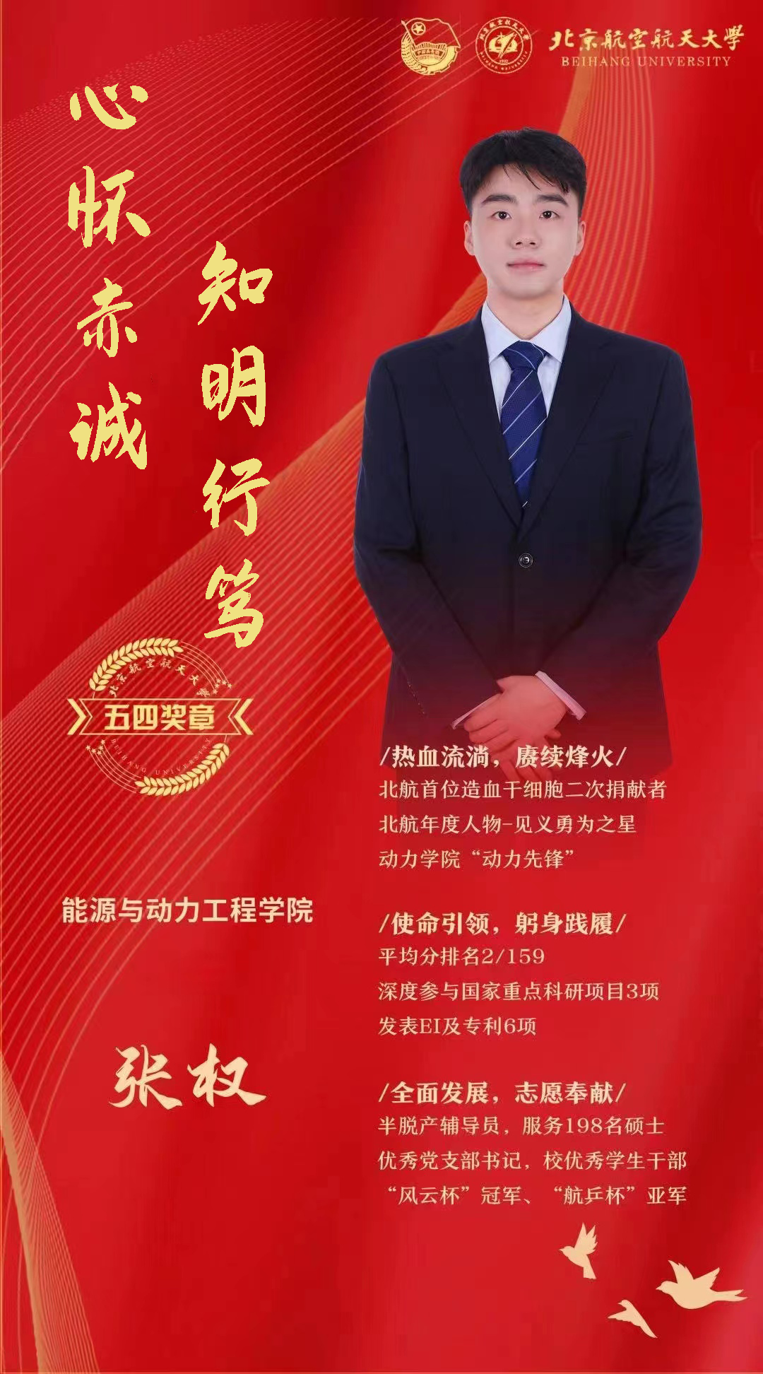 使命在肩,冲锋在前。张权坚定不移听党话、跟党走,扎根思政,奉献学生。担任支部书记期间,主动承担多项党建课题,教育成效受到中央巡视组的称赞,支部党员牢记青年的责任与担当,9成以上就职于国防重点单位,继续贡献北航力量;博士期间,扎根思政,担任动力学院2022级硕士辅导员,为学生点亮理想的灯、照亮前行的路,在他的鼓励下,学生们在学校各类组织中踊跃奉献。他以带一届、育一届、行一届为目标,践行一颗拳拳赤心。