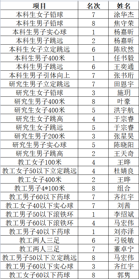 赓续拼搏精神,铸就崭新辉煌,为期两天的运动会圆满闭幕,在动力师生的共同努力之下,运动员们取得优异成绩。多个项目斩获前8,四个项目位居第1,教职工获甲组团体第九名(共21支队伍),本科生获甲组团体第六名、研究生获甲组团体第五名(共25支队伍)、广播操获一等奖、学院获最佳组织奖,动力人交出了满意的拼搏答卷。