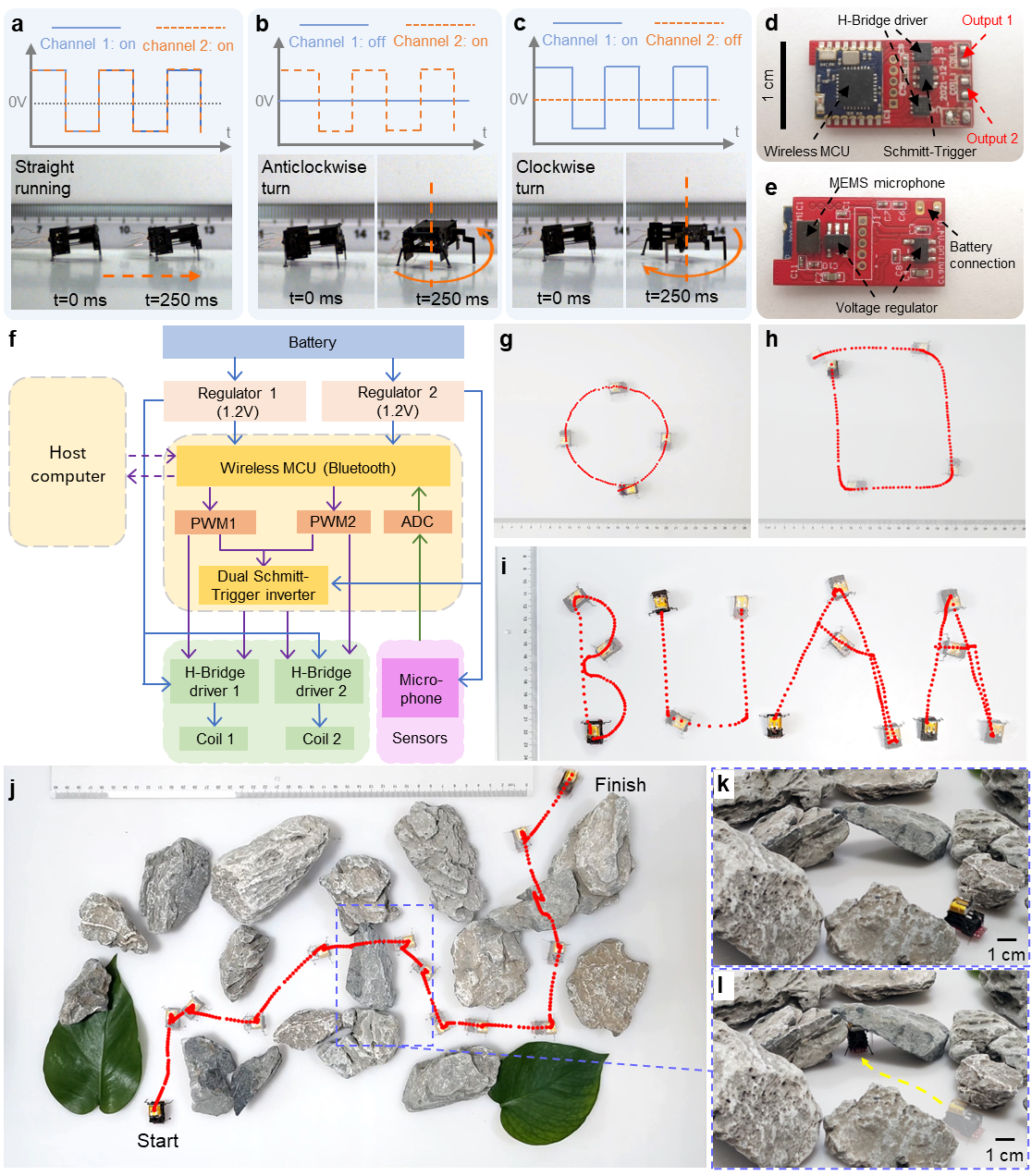 针对机器昆虫的轨迹控制,团队提出了一种基于双腿频率差的控制方法,仅用两路驱动器即可实现BHMbot机器昆虫的驱动和方向控制。基于提出的控制方法,团队研制了厘米级的微型控制和通讯电路(图3de),在集成能源、控制和通讯模块后,BHMbot机器昆虫可实现程序控制和遥控控制。通过预设程序,BHMbot机器昆虫可以实现圆形、矩形(见视频3)和字母“BUAA”运动轨迹(见视频4);同时,通过电脑或手机端发送实时控制指令,BHMbot机器昆虫可采用无线遥控的方式实现运动避障(见视频5)。